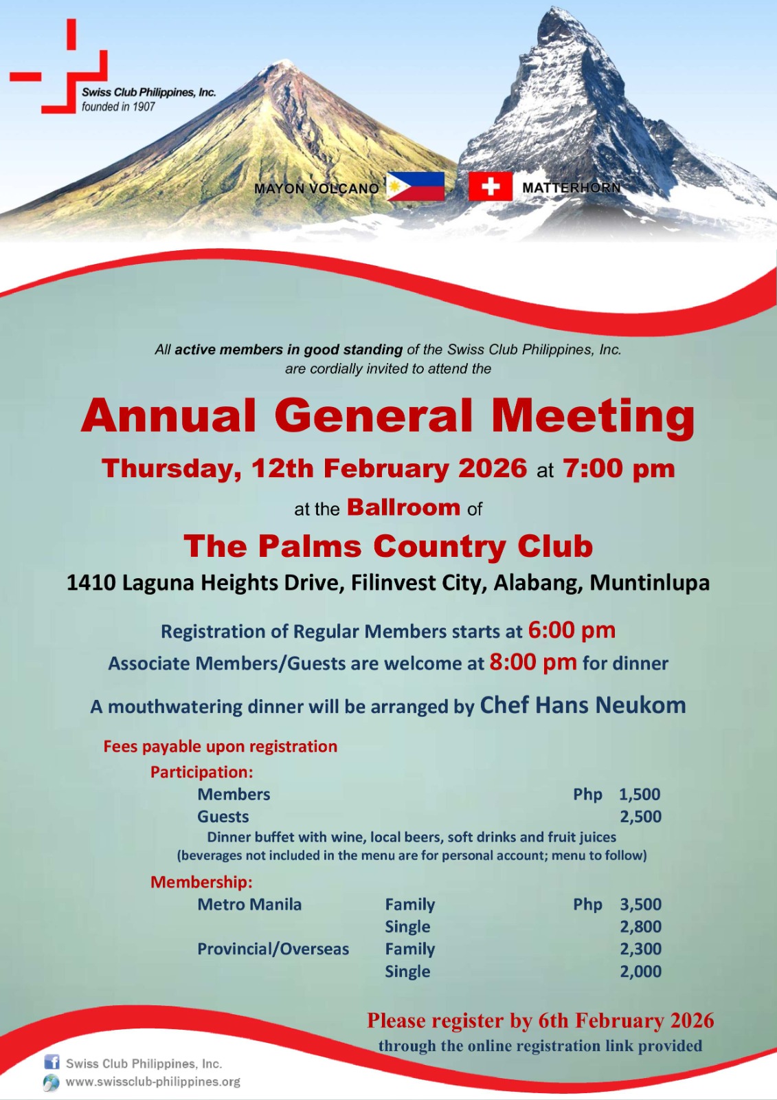 Dear Members and Friends of the Swiss Club, We have recently transitioned to Brevo for our newsletter distribution. We are aware that some members may not have received our emails during this transition, and we apologize for the long silence. We hope this message reaches everyone successfully. As we prepare for our upcoming Annual General Meeting (AGM) 2026, please find the registration and payment details below.